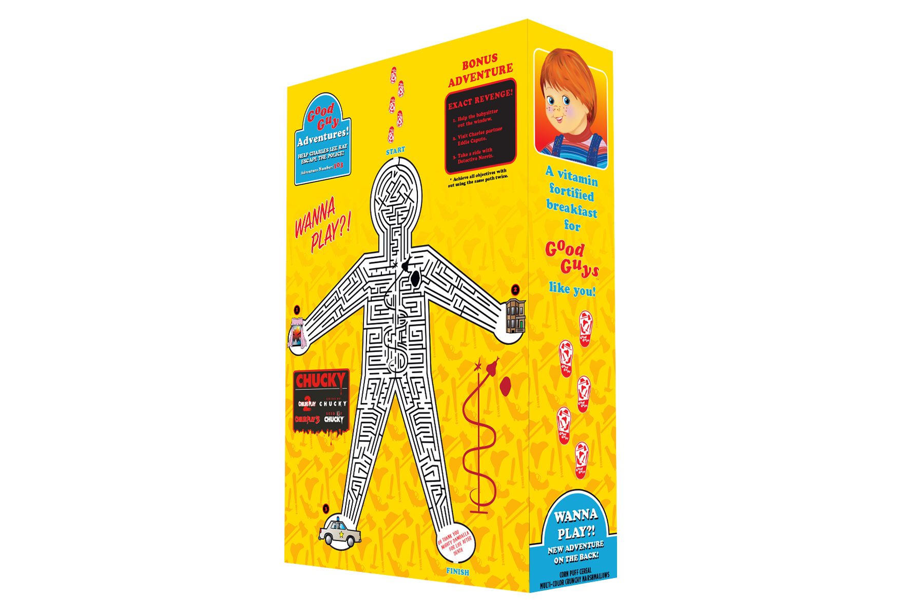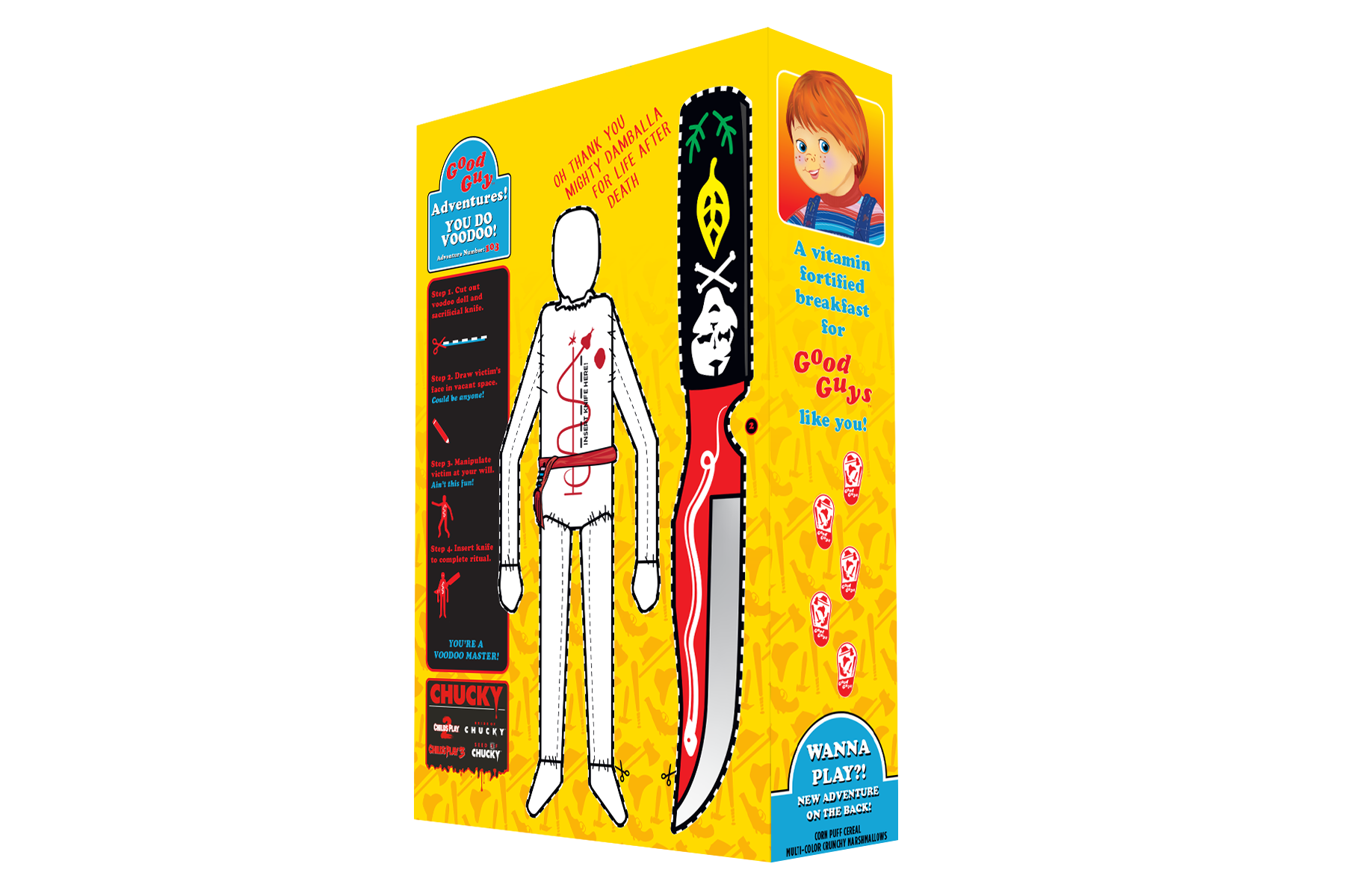Being a horror film fan this was a dream project to design. I designed packaging for three products Good Guys Cereal, Goodies Cereal Snack Clusters and Battery Boost Energy Drink. Keeping the designs immersive for fans I illustrated the packaging to be true to the in-world branding while also adding sinister notes from the film, like the spoon handle on the cereal box cover. Designed to resemble the knife carried by the killer doll. I carried these darker themes into the back content of the cereal box. Developing two options for cereal box activities. The first activity being a voodoo play set based on the movies in-world ritual the killer doll attempts to perform. The second activity, is a maze in the shape of a voodoo doll that hits key movie plot scenes pinned in as you try to exit. These designs added true interactive qualities to this horror collectible.