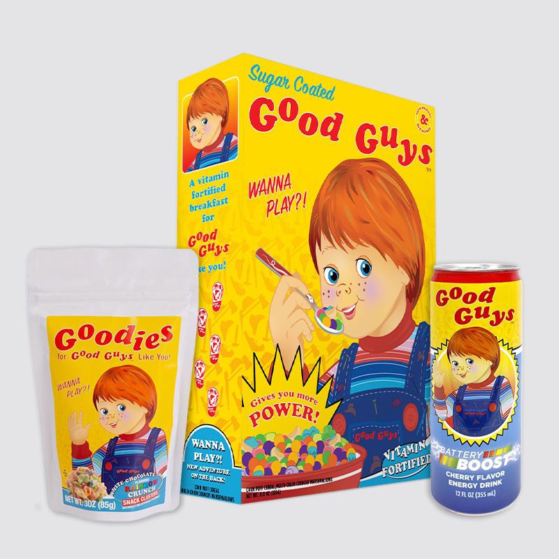 In addition to the cereal design, FYE developed Goodies Cereal Cluster Snacks. This gave fans a more casual opportunity to have a pieces of the Good Guys brand. Completing the collection is the Good Guys Battery Boost Energy Drink. Themed around the in-world batteries that power the Chucky doll this was a great way to continue the branding for Good Guys and complete the immersive experience for fans.