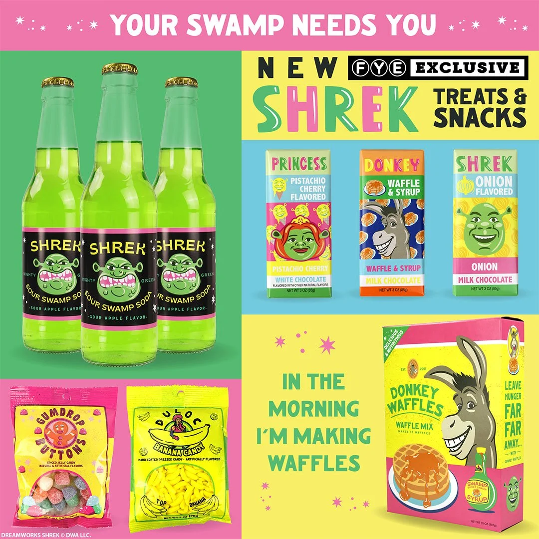 Shrek soda, candy bars, candy bags and waffle mix is a licensed collection brought to the FYE stores for fans of the franchise. Leading the design initiative the team utilized official art and built the line around a key product the Donkey Waffle Mix. Referencing a popular line from the movie “In the morning I’m making waffles”. Supporting this product were additional consumables and merchandise.